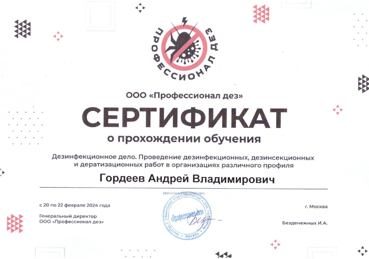 В феврале 2024 года в Москве сотрудник компании Андрей Владимирович Гордеев, в рамках повышения квалификации, успешно прошёл обучение по теме "Дезинфекционное дело. Проведение дезинфекционных, дезинсекционных и дератизационных работ в организациях различного профиля". По результатам обучения был выдан сертификат.