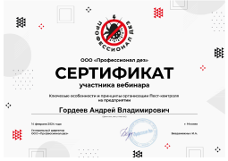 В феврале 2024 года обучение сотрудника компании Андрея Владимировича Гордеева в Москве, в рамках повышения квалификации, успешно прошёл обучение по теме "Ключевые особенности и принципы организации Пест - контроля на предприятии". По результатам обучения был выдан сертификат.